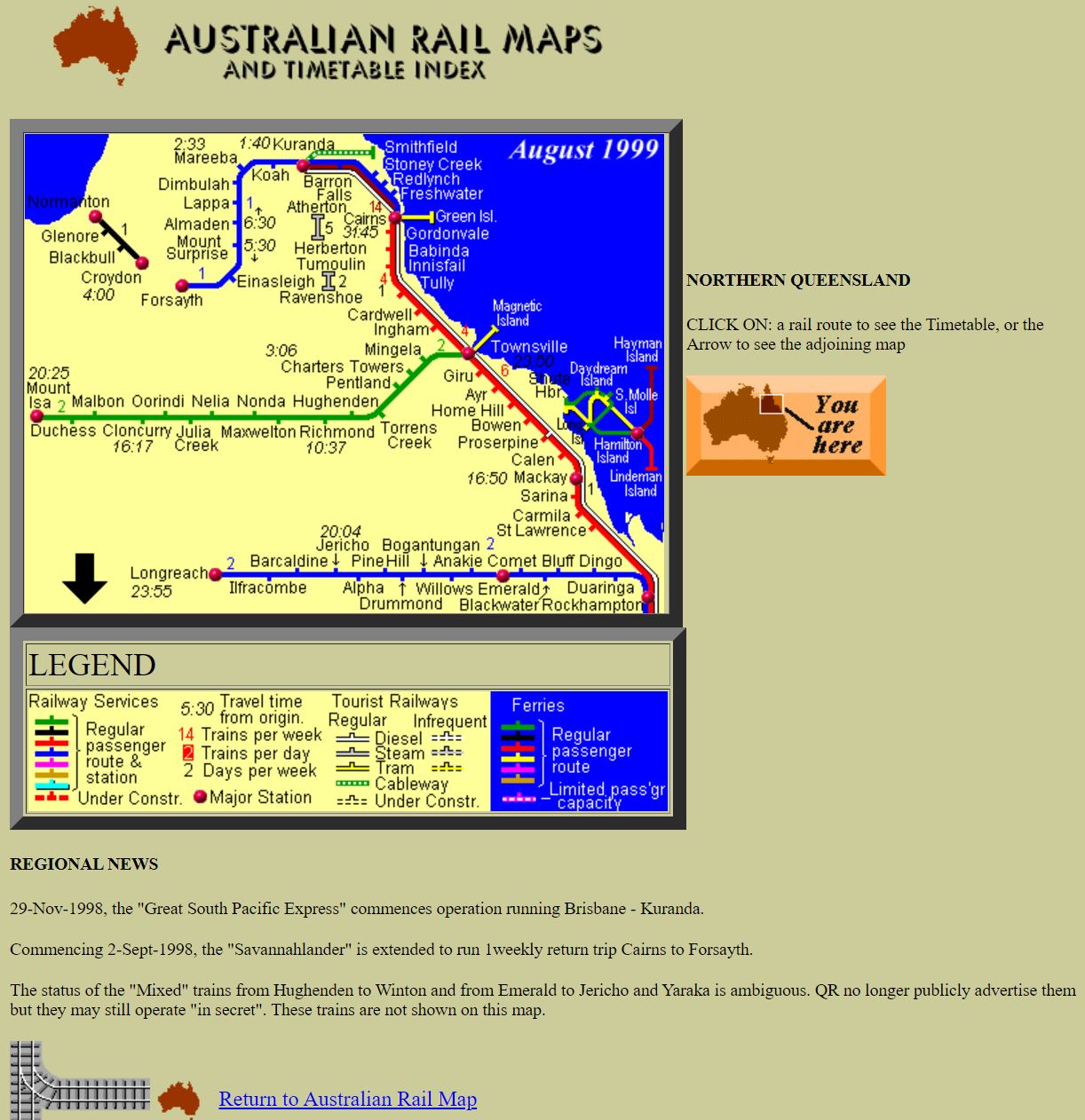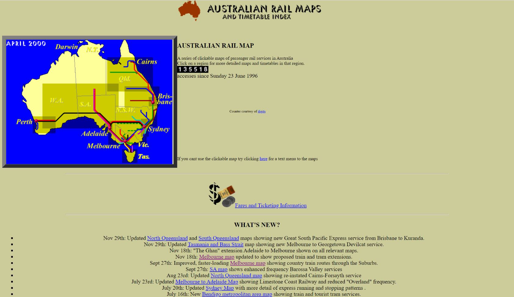 On June 23 1996, Australian Rail Maps went online for the first time. With great 1990s features such as a hit counter and a colour pallete from Jupiter, it was pretty primitive by today's standards, but in 1996 the web was more of a curiosity than an essential part of life.