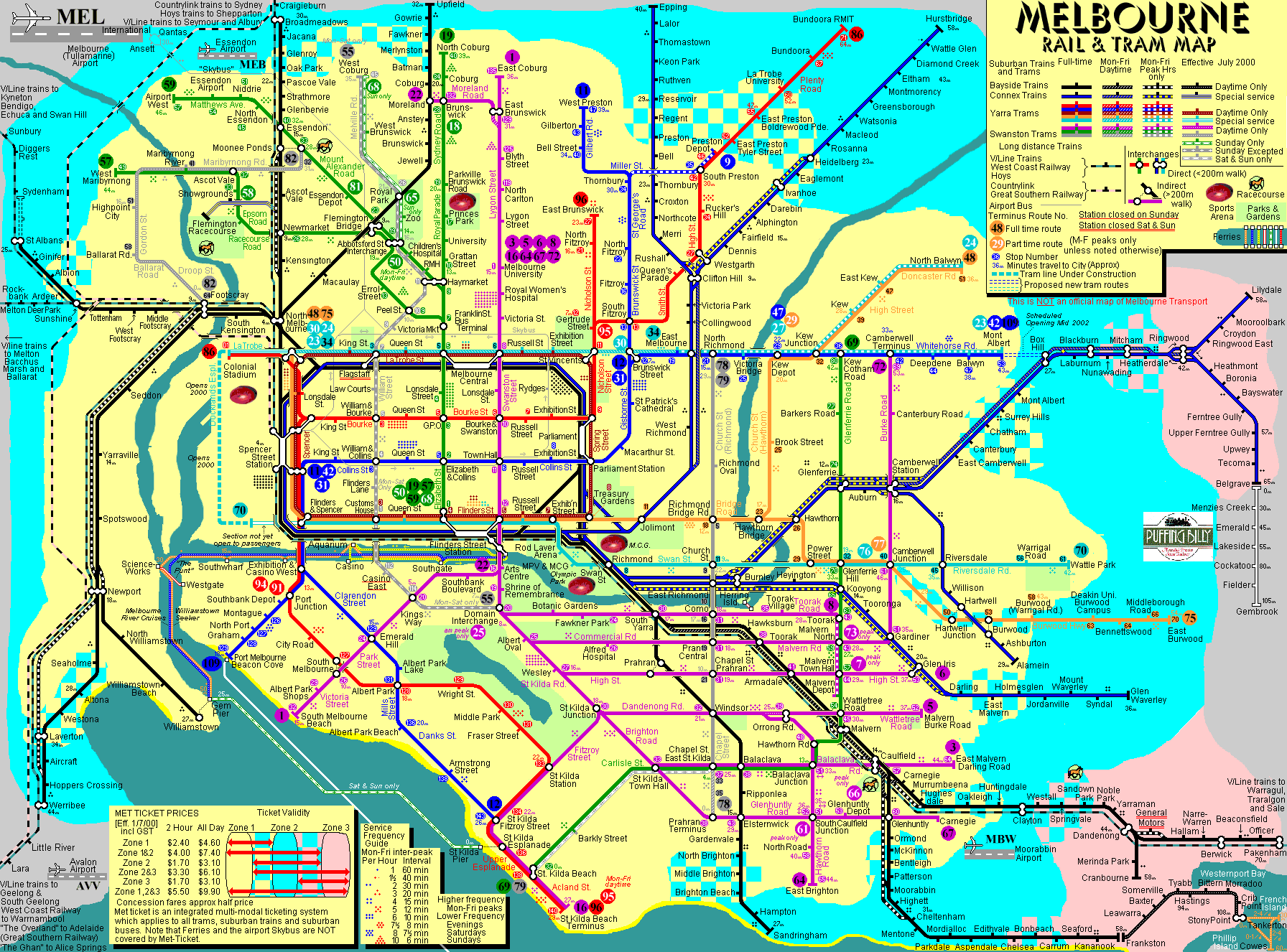 Excellent site covering the whole country, showing passenger trains, suburban and intercity, ferries, airport shuttles, tourist railways etc, with frequencies, some timetable information and much more. Check out the Melbourne city map for its veritable cornucopia of information. Beats the London Tube map hands down. One of my favourite sites, and frequently updated.