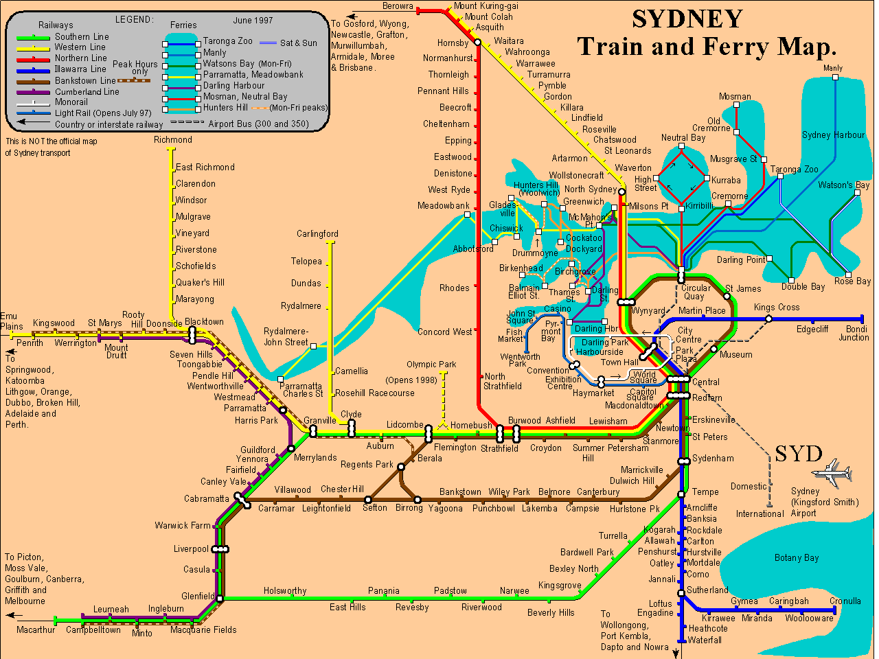 Early versions of the Sydney map had less of the inter-modal connectivity that is seen in Melbourne, but the colours were just as garish but it did have some interesting things in it. Note this is before the airport railway and before the Olympic Park line opened, and way before trains reached Leppington. Also note the Carlingford line is still there, the embryonic light rail is show (noted as opening July '97) and the now-gone Monorail.